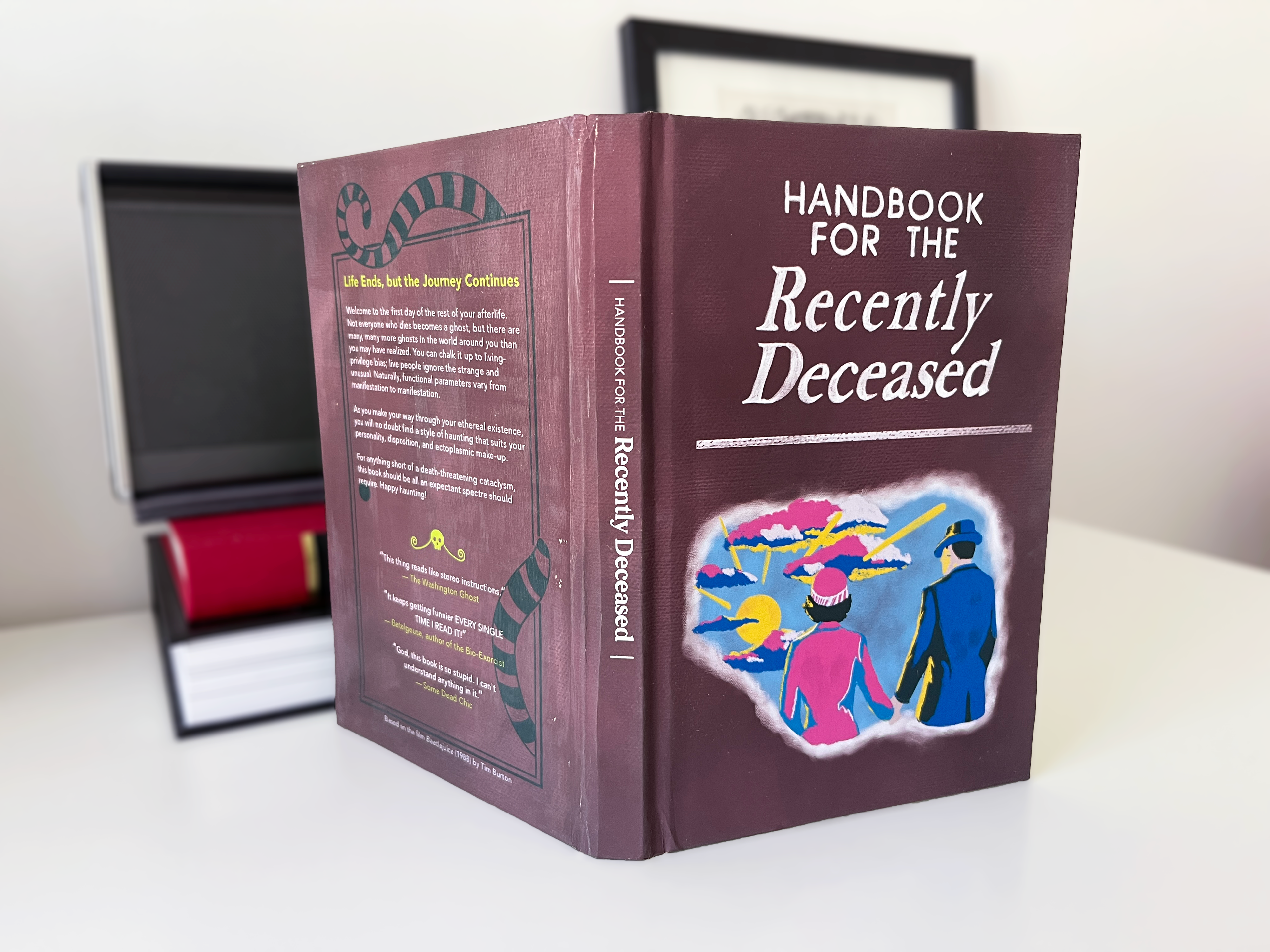 This is a book binding DIY for the Recently Deceased Journal, inspired from the "Beetlejuice" film. I learned how to stitch a coptic binding to create a text block, sewing and gluing multiple signatures. Also, creating a hardcover backing, which was very difficult to assemble, but it still came together nicely.